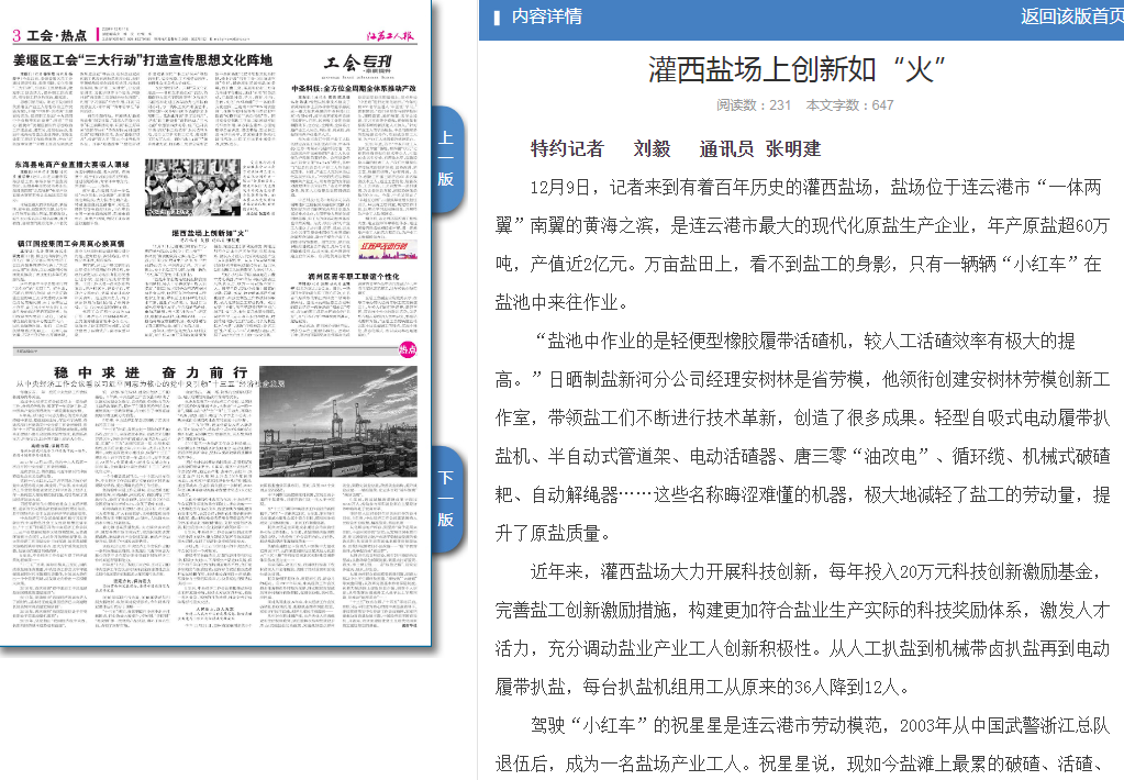 駕駛“小紅車”的祝星星是連云港市勞動模范,2003年從中國武警浙江總隊退伍后,成為一名鹽場產業工人。祝星星說,現如今鹽灘上最累的破碴、活碴、扒鹽、收放塑布都是機械化操作,高強度制鹽工作都被機械取代,極大地減輕鹽工勞動負荷。剛到鹽場工作時,祝星星跟著師傅王新東學習制鹽工藝,長年累月地風吹日曬,祝星星早已沒有當年的白凈膚色,收獲的是成熟的工作經驗,成長為制鹽技術“大拿”,創新“傳統海鹽+新式工藝”生產模式、“216”式單池加鹵法,實現了鹽業生產技藝上的一次次變革。(特約記者 劉毅 通訊員 張明建)