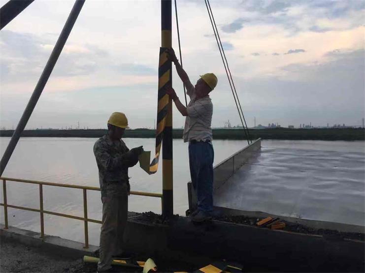 隨著碼頭裝卸業務愈加的繁忙,宵洋物流公司全體員工也都沉浸在這樣的工作狀態中,為碼頭業務拓展舔磚加瓦。常言道“安全無小事”,宵洋碼頭在忙于日常業務開展的同時,也在不斷的完善和落實碼頭場地上的安全保護措施,圖中為碼頭工人正在為場地內的防護欄桿等貼上安全防護條。(宵洋張寶同)