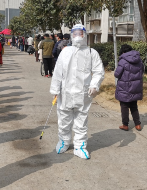 ? ?黨員尹永明,穿好防護(hù)服,帶上手套,口罩和防護(hù)眼鏡,背上30多斤的便攜式噴射器全身“武裝”,變成“大白”開始了一天的工作,從早上7點(diǎn)開始“打起精神努力干”到下午1:30“拖著疲憊的雙腿結(jié)束”。